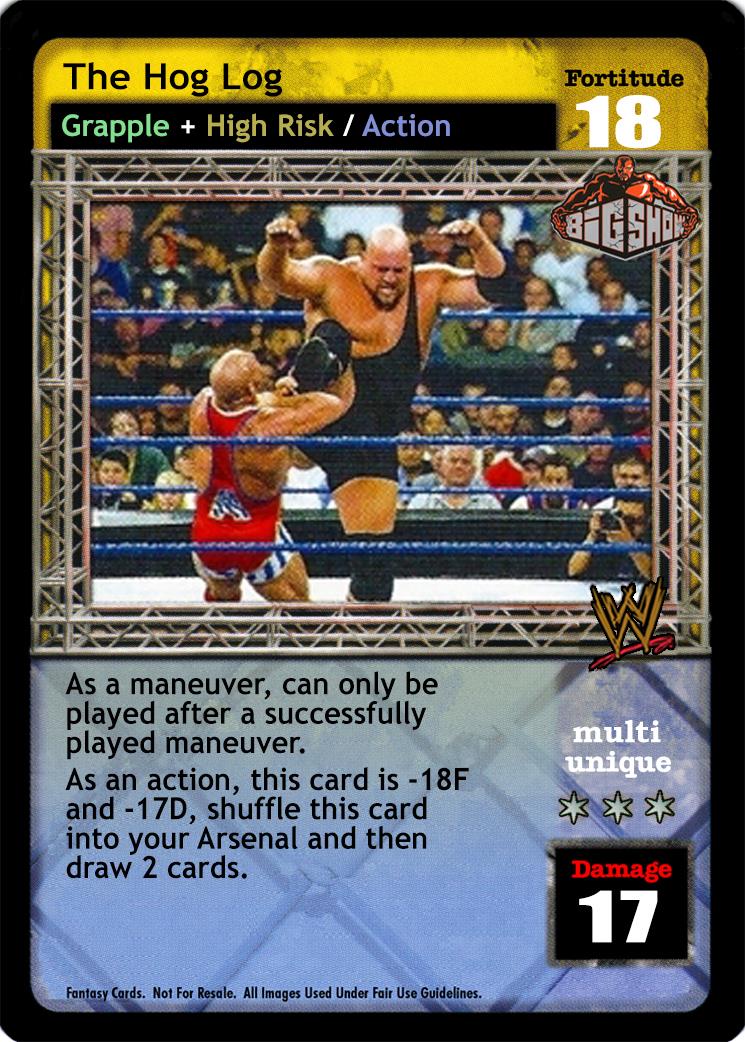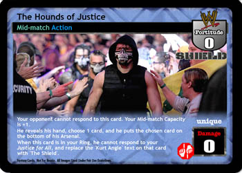 Your opponent cannot respond to this card. Your Mid-match Capacity is +1. He reveals his hand, choose 1 card, and he puts the chosen card on the bottom of his Arsenal. When this card is in your Ring, he cannot respond to your Justice for All, ignore the 'Can only be played...' text, and replace the 'Kurt Angle' text with 'The Shield'.