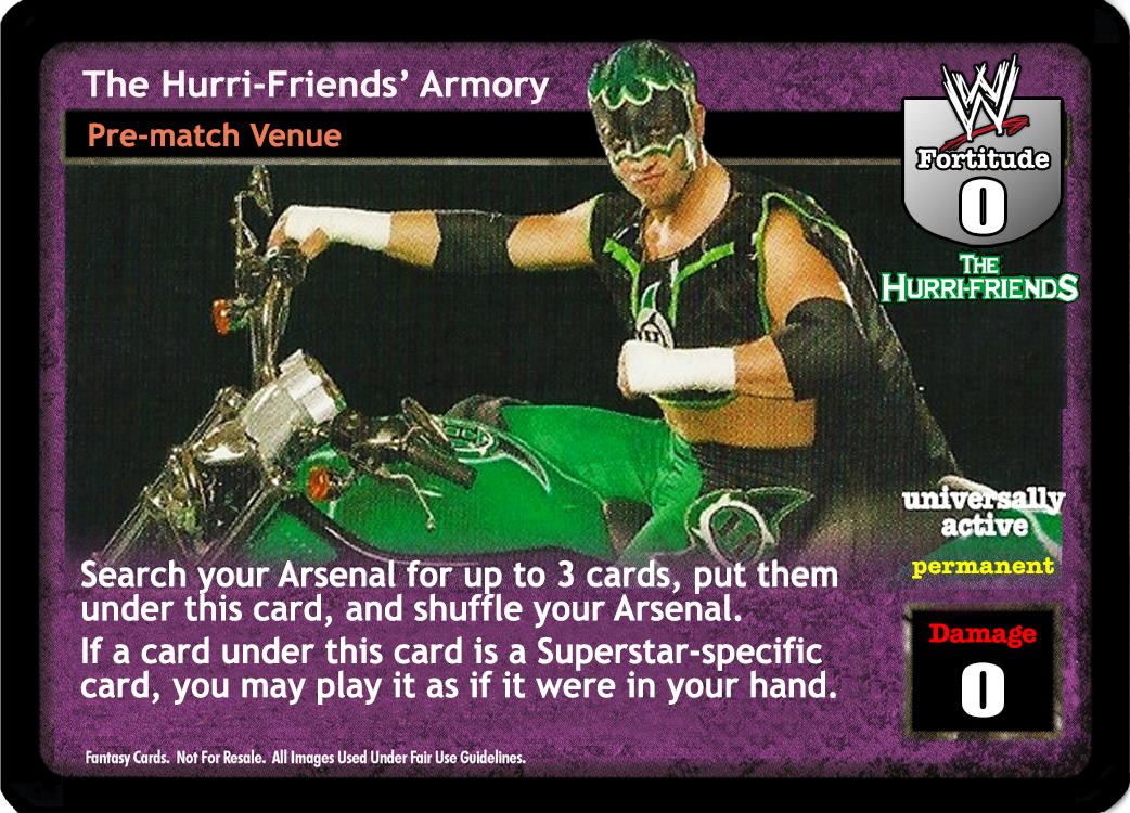 Search your Arsenal for up to 3 cards, put them under this card, and shuffle your Arsenal. If a card under this card is a Superstar-specific card, you may play it as if it were in your hand.