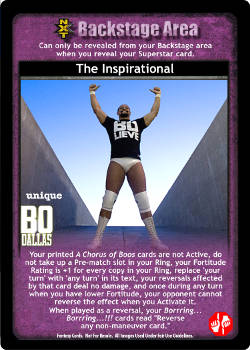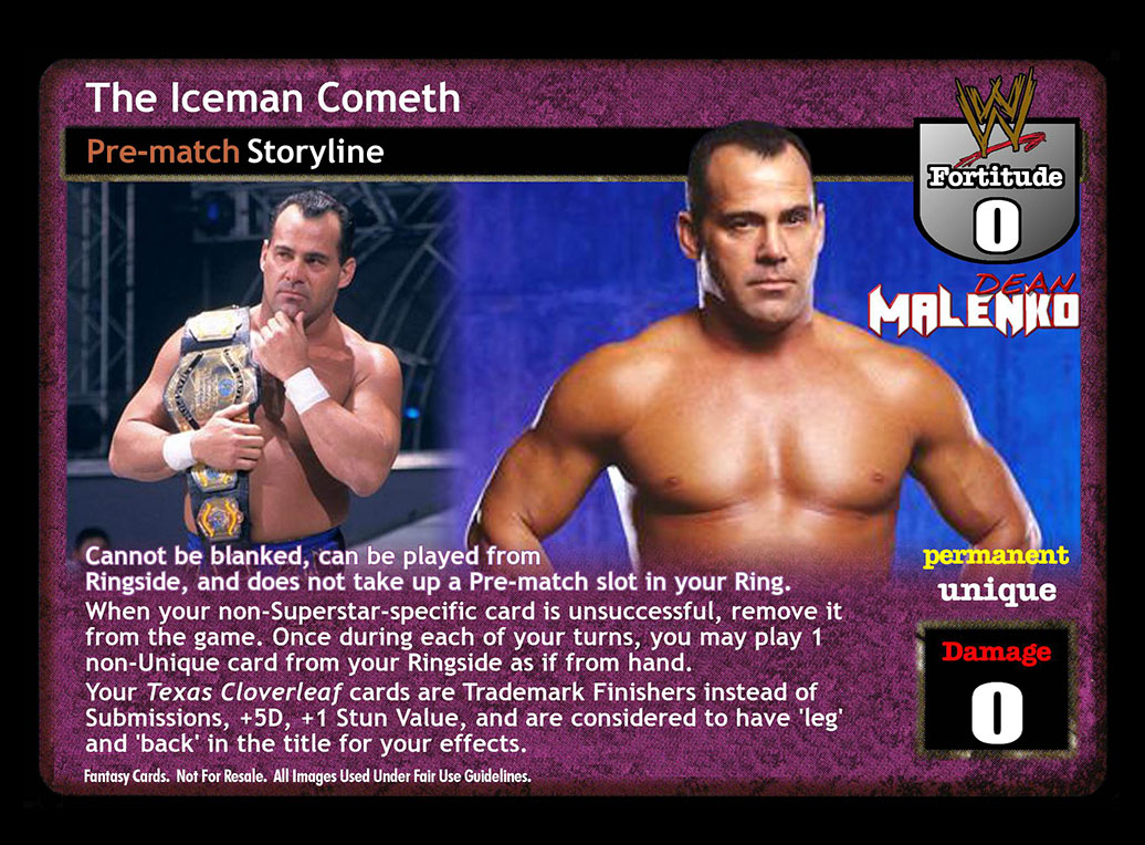 Cannot be blanked, can be played from Ringside, and does not take up a Pre-match slot in your Ring. When your non-Superstar-specific card is unsuccessful, remove it from the game. Once during each of your turns, you may play a non-Unique card from your Ringside as if from hand. Your Texas Cloverleaf cards are Trademark Finishers instead of Submissions, +5D, +1 Stun Value, and are considered to have 'leg' and 'back' in the title for your effects.