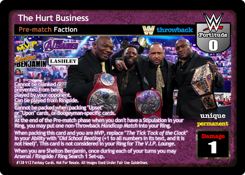 Cannot be blanked or prevented from being played by your opponent. Can be played from Ringside. Cannot be packed when packing Upset or Upon cards, or Boogeyman-specific cards. At the end of the Pre-match phase when you don't have a Stipulation in your Ring, you may put one non-Throwback Handicap Match into your Ring. When packing this card and you are MVP, replace The Tick Tock of the Clock in your Ability with Old School Beating (+1 to all numbers in its text, and it is not Heel). This card is not considered in your Ring for The V.I.P. Lounge. When you are Shelton Benjamin, once during each of your turns you may Arsenal / Ringside / Ring Search 1 Set-up.