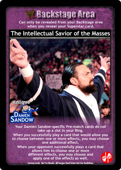 Your Damien Sandow-specific Pre-match cards do not take up a slot in your Ring. When you successfully play a card that would allow you to choose between one or more effects, you may choose one additional effect. When your opponent successfully plays a card that allows him to choose one or more different effects, you may choose and apply one of the effects as well.