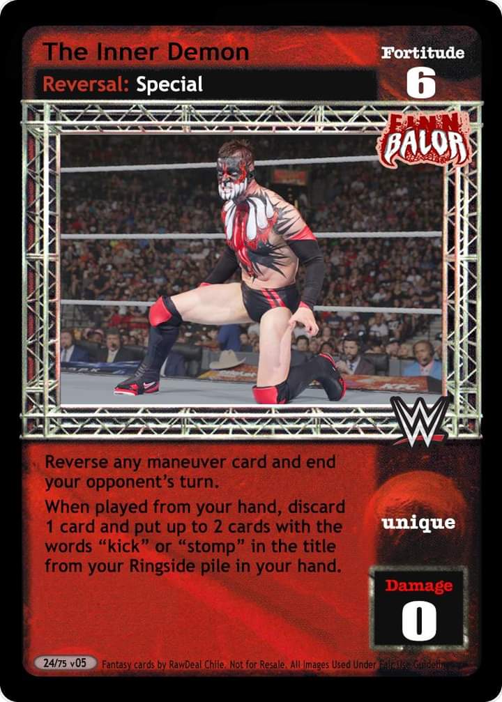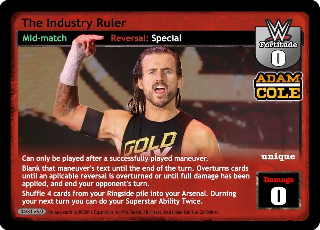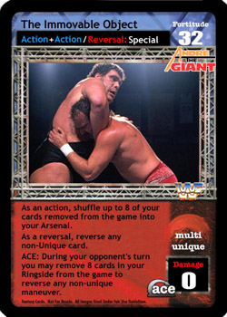 Can only be played after a successfully played maneuver. Blank that maneuver’s text until the end of the turn. Overturn cards until an applicable reversal is overturned or until full damage has been applied and end your opponent`s turn. Shuffle 4 cards from your ringside pile into your arsenal. During your next turn you can do your superstar ability twice.