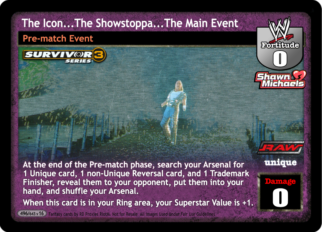 At the end of the Pre-match phase, search your Arsenal for 1 Unique card, 1 non-Unique Reversal card, and 1 Trademark Finisher, reveal them to your opponent, put them into your hand, and shuffle your Arsenal. When this card is in your Ring area, your Superstar Value is +1.