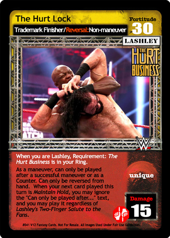 When you are Lashley, Requirement: The Hurt Business is in your Ring. As a maneuver, can only be played after a successful maneuver or as a Counter. Can only be reversed from hand. When your next card played this turn is Maintain Hold, you may ignore the Can only be played after... text, and you may play it regardless of Lashley's Two-Finger Salute to the Fans.