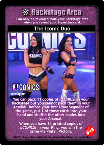 You can pack 11 copies of IICONICS! in your Backstage but you cannot pack them in your Arsenal. Before your first Draw Segment of the game, put 1 of those cards into your hand and shuffle the other copies into your Arsenal. They do not count as Superstar-specific for Not On My Broadcast!. When you have 11 printed copies of IICONICS! in your Ring, you win the game via Pinfall Victory.
