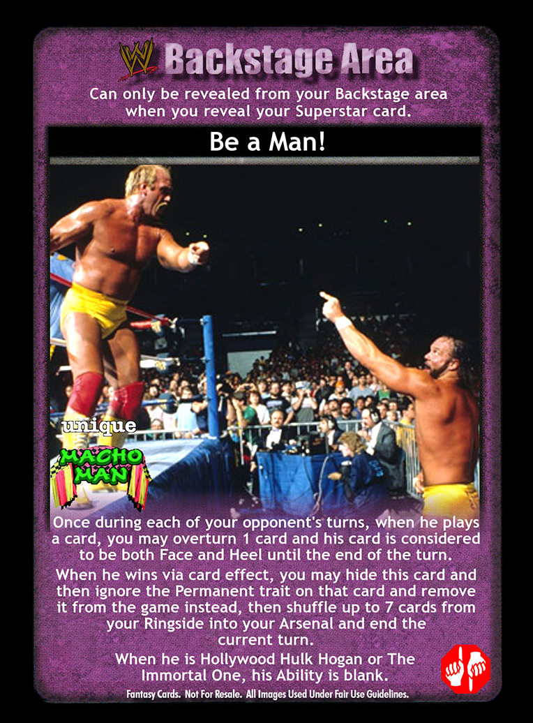 Once during each of your opponent's turns, when he plays a card, you may overturn 1 card and his card is considered to be both Face and Heel until the end of the turn. When he wins via card effect, you may hide this card and then ignore the Permanent trait on that card and remove it from the game instead, then shuffle up to 7 cards from your Ringside into your Arsenal and end the current turn. When he is Hollywood Hulk Hogan or The Immortal One, his Ability is blank.