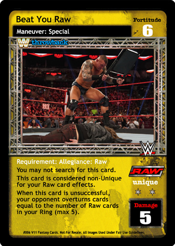 Requirement: Allegiance: Raw You may not search for this card. This card is considered non-Unique for your Raw card effects. When this card is unsuccessful, your opponent overturns cards equal to the number of Raw cards in your Ring (max 5).