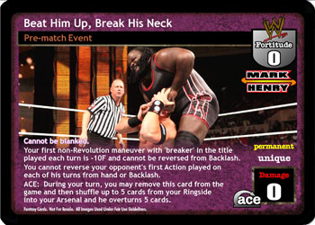 Cannot be blanked. Your first non-Revolution maneuver with 'breaker' in the title played each turn is -10F and cannot be reversed from Backlash. You cannot reverse your opponent's first Action played of each of his turns from hand or Backlash. ACE: During your turn, you may remove this card from the game and then shuffle up to 5 cards from your Ringside into your Arsenal and he overturns 5 cards.