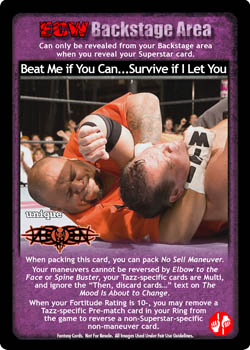 When packing this card, you can pack No Sell Maneuver. Your maneuvers cannot be reversed by Elbow to the Face or Spine Buster, Your Tazz-specific cards are Multi, and ignore the 'Then, discard cards...' text on The Mood Is About to Change. When your Fortitude Rating is 10-, you may remove a Tazz-specific Pre-match card in your Ring from the game to reverse a non-Superstar-specific non-maneuver card.
