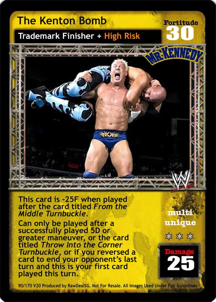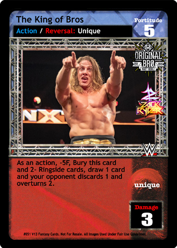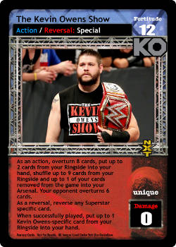 As an action, overturn 8 cards, put up to 2 cards from your Ringside into your hand, shuffle up to 9 cards from your Ringside and up to 1 of your cards removed from the game into your Arsenal. Your opponent overturns 6 cards. As a reversal, reverse any Superstar-specific card. When successfully played, put up to 1 Kevin Owens-specific card from your Ringside into your hand.