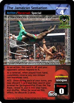 As an action, this card is -4F and your opponent cannot respond to it. As a reversal, when played from your hand, completely reverse any non-Unique non-maneuver card. ACE: Once during each of your turns, you may discard 1 card and then search your Arsenal for Springboard or From the Top Rope, reveal it, put it into your hand, and shuffle. When he reverses this effect, he discards 2 cards.