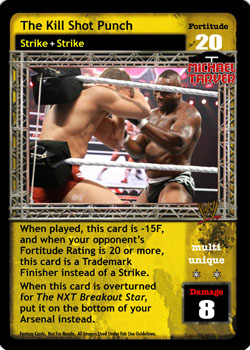 When played, this card is -15F, and when your opponent's Fortitude Rating is 20 or more, this card is a Trademark Finisher instead of a Strike. When this card is overturned for The NXT Breakout Star, put it on the bottom of your Arsenal instead.