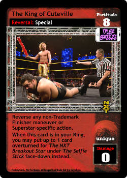 Reverse any non-Trademark Finisher maneuver or Superstar-specific action. When this card is in your Ring, you may put up to 1 card overturned for The NXT Breakout Star under The Selfie Stick face-down instead.
