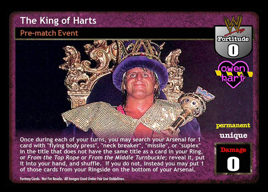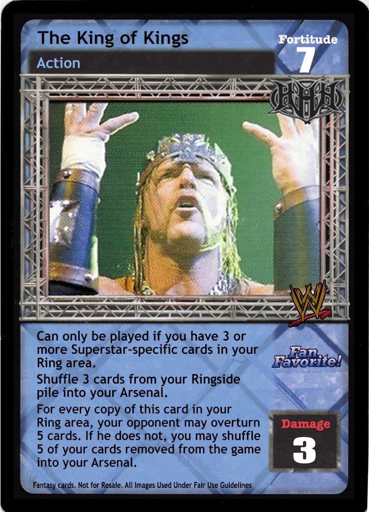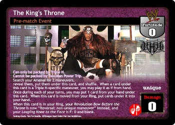 Can only be packed by Triple H. Cannot be packed by Two-Man Power Trip. Search your Arsenal for 2 maneuvers, reveal them, put them under this card, and shuffle. When a card under this card is a Triple H-specific maneuver, you may play it as if from hand. Once during each of your turns, you may put 1 card from your hand under this card. When this card is moved from your Ring, put cards under it into your hand. When this card is in your Ring, your Revolution Bow Before the Throne is now 'Reversal: non-unique Maneuver' instead; and your Leaping Knee to the Face is F: 0 and blank.