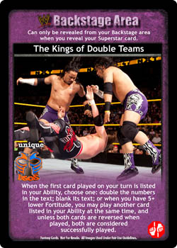 When the first card played on your turn is listed in your Ability, choose one: double the numbers in the text; blank its text; or when you have 5+ lower Fortitude, you may play another card listed in your Ability at the same time, and unless both cards are reversed when played, both are considered successfully played.