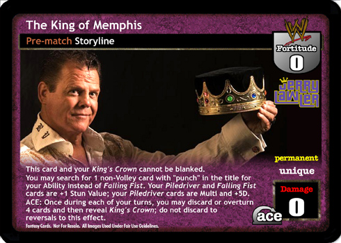 This card and your King's Crown cannot be blanked. You may search for a non-Volley card with 'punch' in the title for your Ability instead of Falling Fist. ACE: Once during each of your turns, you may discard or overturn 4 cards and then reveal King's Crown; do not discard to reversals to this effect. Your Piledriver and Falling Fist cards are +1 Stun Value; your Piledriver cards are Multi and +5D.