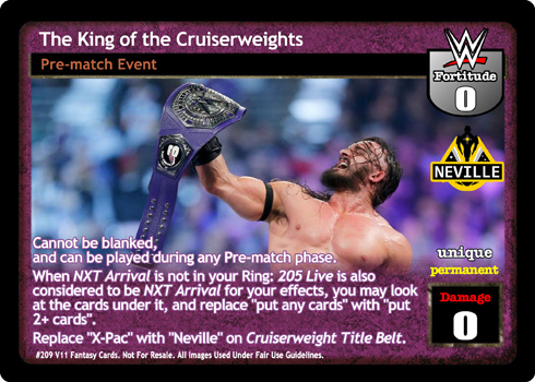 Cannot be blanked, and can be played during any Pre-match phase. When NXT Arrival is not in your Ring: 205 Live is also considered to be NXT Arrival for your effects, you may look at the cards under it, and replace 'put any cards' with 'put 2+ cards'. Replace 'X-Pac' with 'Neville' on Cruiserweight Title Belt.