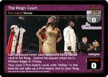 Can be played when your opponent has a Venue card in his Ring. Cannot be played when he is William Regal or Finlay. Your next 3 Pre-match cards with 'Volley' in the text do not take up a Pre-match slot in your Ring.