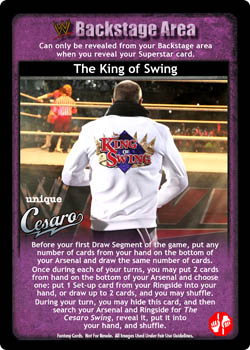 Before your first Draw Segment of the game, put any number of cards from hand on the bottom of your Arsenal and draw the same number of cards. Once during each of your turns, you may put 2 cards from hand on the bottom of your Arsenal and choose one: put 1 printed Set-up card from your Ringside into your hand, or draw up to 2 cards, and you may shuffle. During your turn, you may hide this card, and then search your Arsenal and Ringside for The Cesaro Swing, reveal it, put it into your hand, and shuffle.