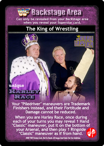 Your 'Piledriver' maneuvers are Trademark Finishers instead, and their Fortitude and Damage cannot be reduced. When you are Harley Race, once during each of your turns you may reveal 1 Hand 'Classic' maneuver, put it on the bottom of your Arsenal, and then play 1 Ringside 'Classic' maneuver as if from hand.