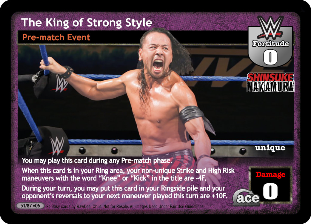 You may play this card during any Pre-match phase. When this card is in your Ring area, your non-unique Strike and High Risk maneuvers with the word "Knee" or "Kick" in the title are -4F. During your turn, you may put this card in your Ringside pile and your opponent's reversals to your next maneuver played this turn are +10F.