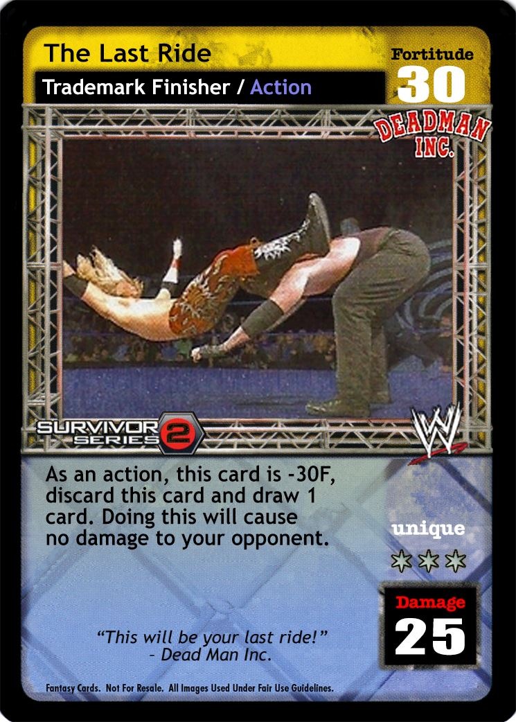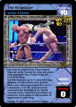 Can only be reversed by 2 non-hybrid reversal cards. Cannot be reversed when your opponent has a Triple H-specific card in his Ring. Put this card and up to 3 cards from your Ringside on the bottom your Arsenal. When your next card played this turn is a maneuver, it is -5F, and cannot be reversed from Backlash or by hybrid reversal cards; when it is successful, he overturns cards equal to the number of maneuvers in your Ring.