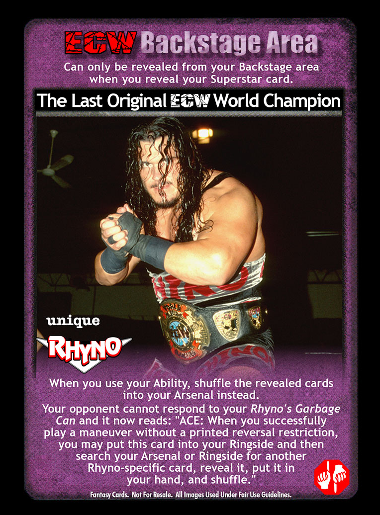 When you use your Ability, shuffle the revealed cards into your Arsenal instead. Your opponent cannot respond to your Rhynos Garbage Can and it now reads: 'ACE: When you successfully play a maneuver without a printed reversal restriction, you may put this card into your Ringside and then search your Arsenal or Ringside for another Rhyno-specific card, reveal it, put it in your hand, and shuffle.'