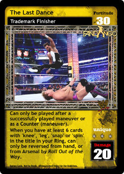 Can only be played after a successfully played maneuver or as a Counter (maneuver). When you have at least 6 cards with 'knee', 'leg', 'snap' or 'spin' in the title in your Ring, can only be reversed from hand, or from Arsenal by Roll Out of the Way.