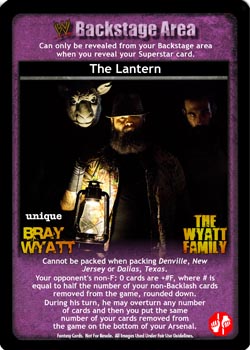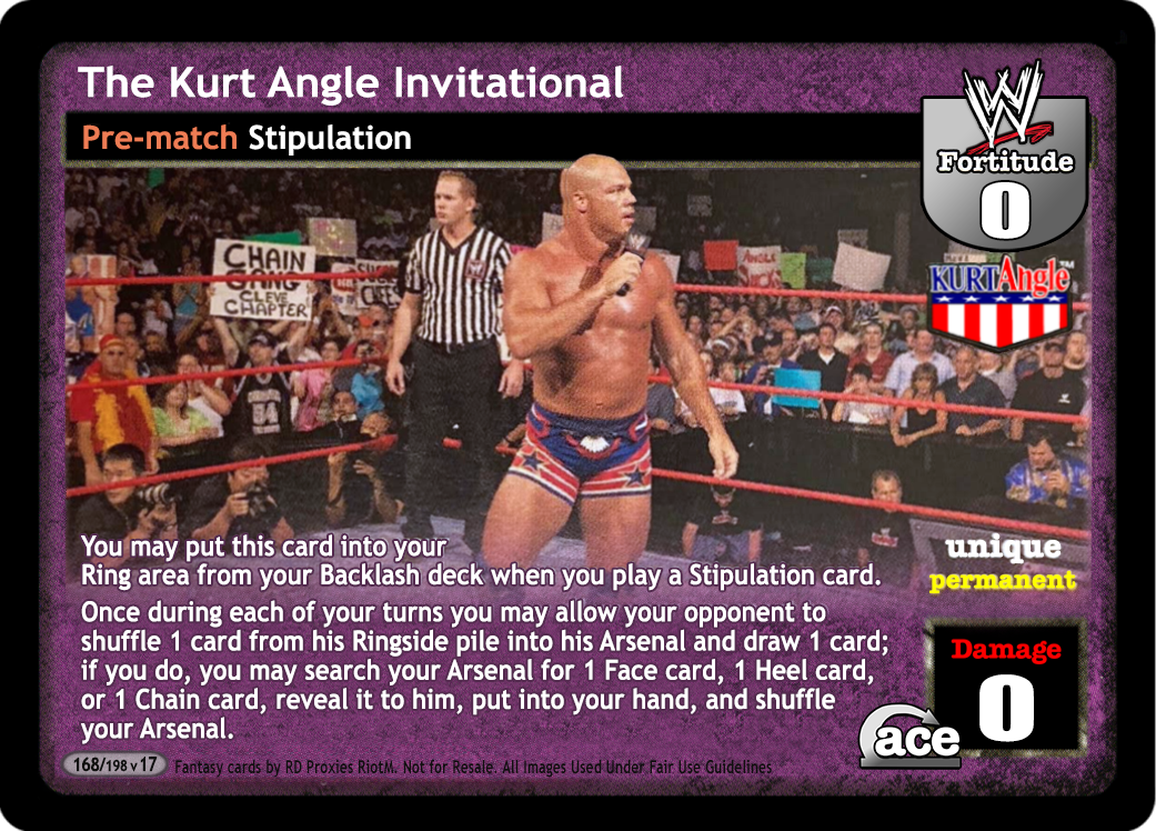 You may put this card into your Ring area from your Backlash deck when you play a Stipulation card. Once during each of your turns you may allow your opponent to shuffle 1 card from his Ringside pile into his Arsenal and draw 1 card; if you do, you may search your Arsenal for 1 Face card, 1 Heel card, or 1 Chain card, reveal it to him, put into your hand, and shuffle your Arsenal.