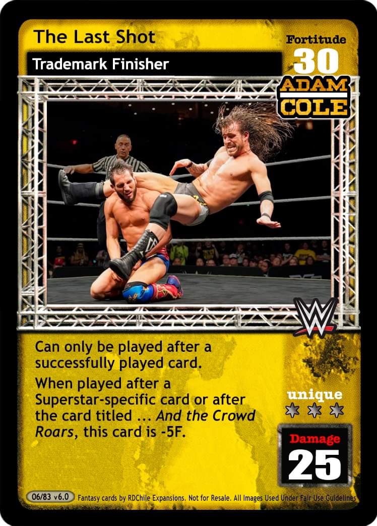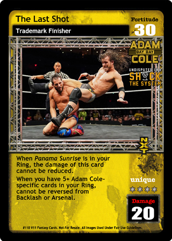 When Panama Sunrise is in your Ring, the damage of this card cannot be reduced. When you have 5+ Adam Cole-specific cards in your Ring, cannot be reversed from Backlash or Arsenal.