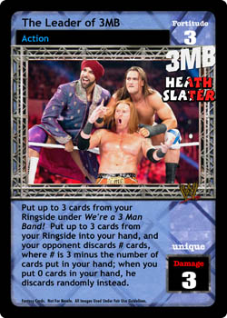 Put up to 3 cards from your Ringside under We're a 3 Man Band! Put up to 3 cards from your Ringside into your hand, and your opponent discards # cards, where # is 3 minus the number of cards put in your hand; when you put 0 cards in your hand, he discards randomly instead.