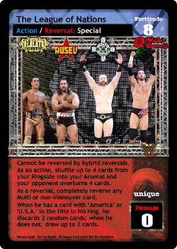 Cannot be reversed by hybrid reversals. As an action, shuffle up to 4 cards from your Ringside into your Arsenal and your opponent overturns 4 cards. As a reversal, completely reverse any Multi or non-maneuver card. When he has a card with µAmerica or 'U.S.A.' in the title in his ring, he discards 2 random cards; when he does not, draw up to 2 cards.