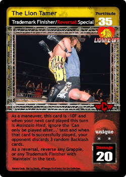 As a maneuver, this card is -10F and when your next card played this turn is Maintain Hold, ignore the 'Can only be played after...' text and when that card is successfully played, your opponent discards 3 random Backlash cards. As a reversal, reverse any Grapple, or any Trademark Finisher with 'Maintain' in the text.