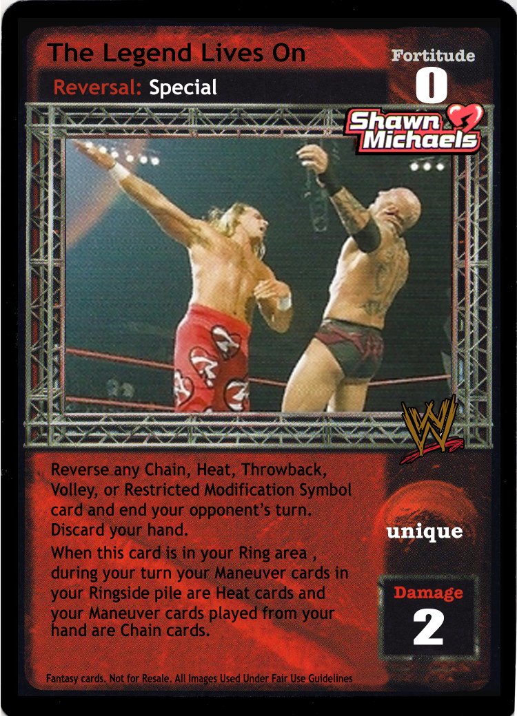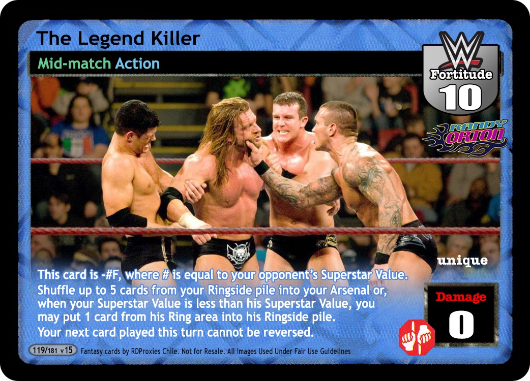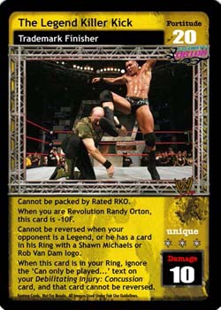 Cannot be packed by Rated RKO. When you are Revolution Randy Orton, this card is -10F. Cannot be reversed when your opponent is a Legend, or has a card in his Ring with a Shawn Michaels or Rob Van Dam logo. When this card is in your Ring, ignore the µCan only be played' text on your Debilitating Injury: Concussion card, and it cannot be reversed.