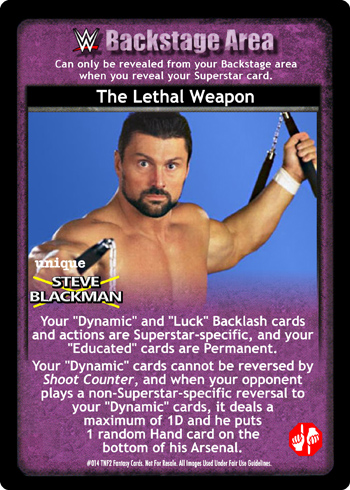 Your 'Dynamic' and 'Luck' Backlash cards and actions are Superstar-specific, and your 'Educated' cards are Permanent. Your 'Dynamic' cards cannot be reversed by Shoot Counter, and when your opponent plays a non-Superstar-specific reversal to your 'Dynamic' cards, it deals a maximum of 1D and he puts 1 random Hand card on the bottom of his Arsenal.