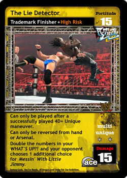 Can only be played after a successfully played 4D+ Unique maneuver. Can only be reversed from hand or Arsenal. Double the numbers in your WHAT'S UP?! and your opponent chooses 1 additional choice for Messin' With Little Jimmy.