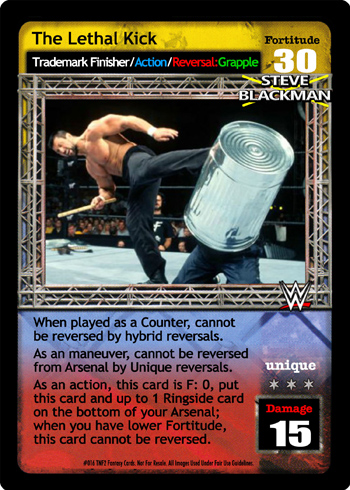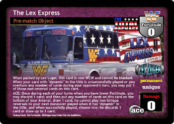 When packed by Lex Luger, this card is now WCW and cannot be blanked. When your card with 'dynamic' in the title is unsuccessfully played or you overturn any number of cards during your opponent's turn, you may put 1 of those non-reversal cards on this card. ACE: Once during each of your turns when you have lower Fortitude, you may discard 1 card; and then put any number of cards on this card on the bottom of your Arsenal, draw 1 card, he cannot play non-Unique reversals to your next maneuver played when it has 'dynamic' in the title, and when successfully played, choose one: he discards 1 card or he overturns 1 card.
