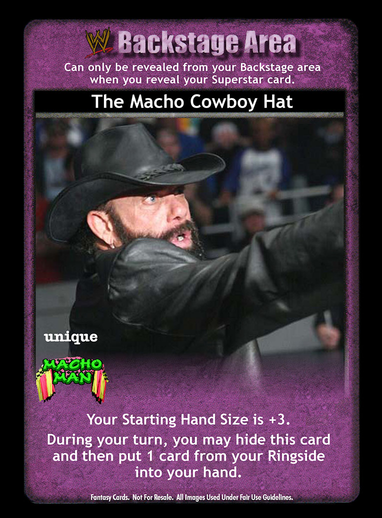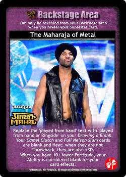 Replace the 'played from hand' text with 'played from hand or Ringside' on your Drawing a Blank. Your Camel Clutch and Full Nelson Slam cards are blank and Heat; when they are not Throwback they are also +3D. When you have 10+ lower Fortitude, your Ability is considered blank for your card effects.