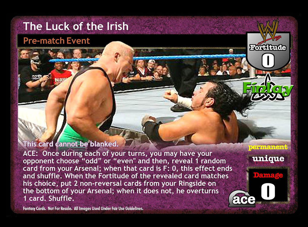 This card cannot be blanked. ACE: Once during each of your turns, you may have your opponent choose 'odd' or 'even.' Then, reveal 1 random card from your Arsenal; when that card is F: 0, this effect ends and shuffle your Arsenal. When the Fortitude of the revealed card matches his choice, put 2 non-reversal cards from your Ringside on the bottom of your Arsenal; when it does not, he overturns 1 card. Shuffle your Arsenal.