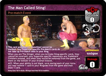 This card and your It's Showtime! cannot be blanked. Your Superstar-specific Pre-match cards do not take up Pre-match slots in your Ring. When you are The Stinger, when you Activate Sting-specific cards, they cannot be reversed; your Superstar-specific maneuvers are Trademark Finishers instead, and when they would be removed from the game, put them on the bottom of your Arsenal instead. ACE: When your ability is not blank, once during each of your turns you may remove 1 card in your Ringside from the game and then draw 1 card.