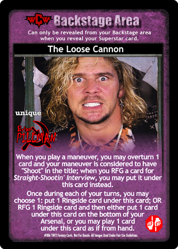 When you play a maneuver, you may overturn 1 card and your maneuver is considered to have 'Shoot' in the title; when you RFG a card for Straight-Shootin' Interview, you may put it under this card instead. Once during each of your turns, you may choose 1: put 1 Ringside card under this card; OR RFG 1 Ringside card and then either put 1 card under this card on the bottom of your Arsenal, or you may play 1 card under this card as if from hand.