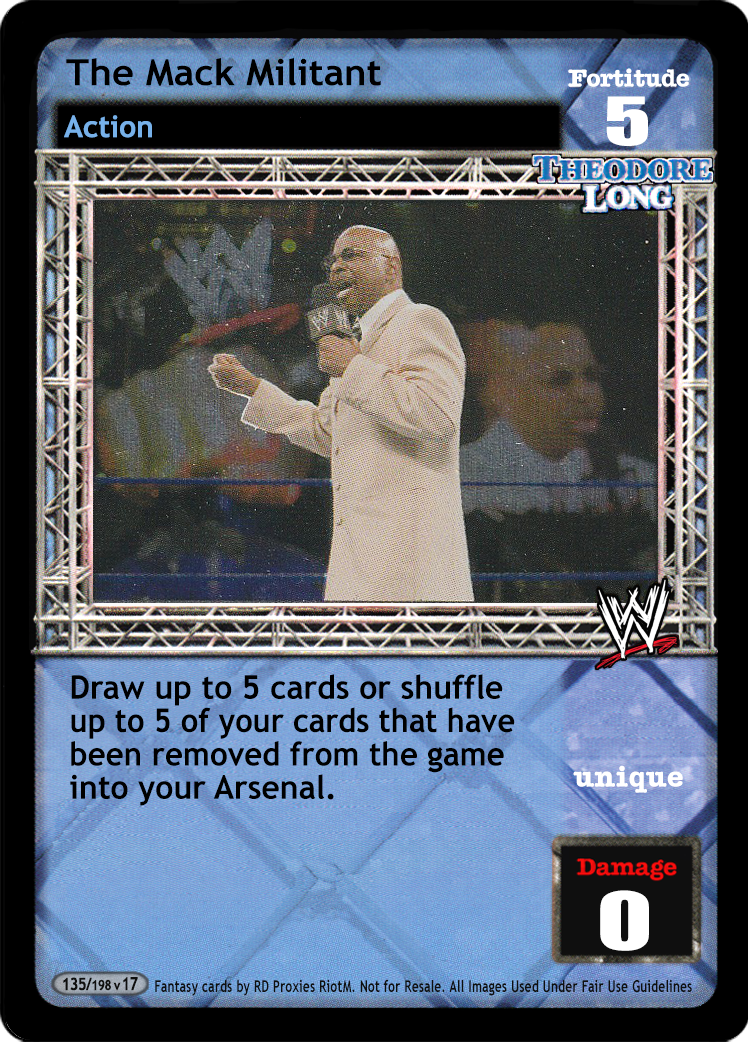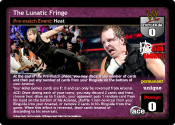 At the end of the Pre-match phase, you may discard any number of cards and then put any number of cards from your Ringside on the bottom of your Arsenal. Your Mind Games cards are F: 0 and can only be reversed from Arsenal. ACE: Once during each of your turns, you may discard 2 cards and then choose two: draw up to 3 cards, your opponent puts 1 random card from his hand on the bottom of his Arsenal, shuffle 1 non-reversal from your Ringside into your Arsenal, or remove 2 cards in his Ringside from the game. When this effect is reversed, draw cards instead of discarding to his reversals.