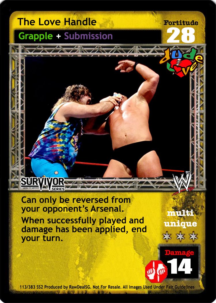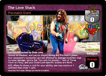 Can only be packed by Dude Love. Cannot be blanked, and can be played during any Pre-match phase. Your opponents maneuvers are not affected by damage modifiers that increase damage, ignore the 'Can only be played...' text of Three Faces of Foley, and your Dude Love-specific actions are Multi. ACE: When he draws a card for your Ability, you may overturn 1 card and draw 1 card.