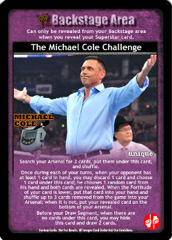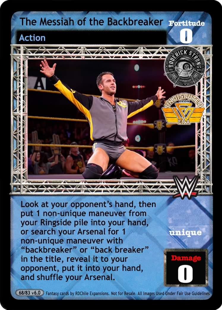 Look at your opponent`s hand, then put 1 non-unique maneuver from your ringside pile into your hand or search your arsenal for 1 non-unique maneuver with “backbreaker” or “back breaker” in the title, reveal it to your opponent, put it into your hand, and shuffle your arsenal.