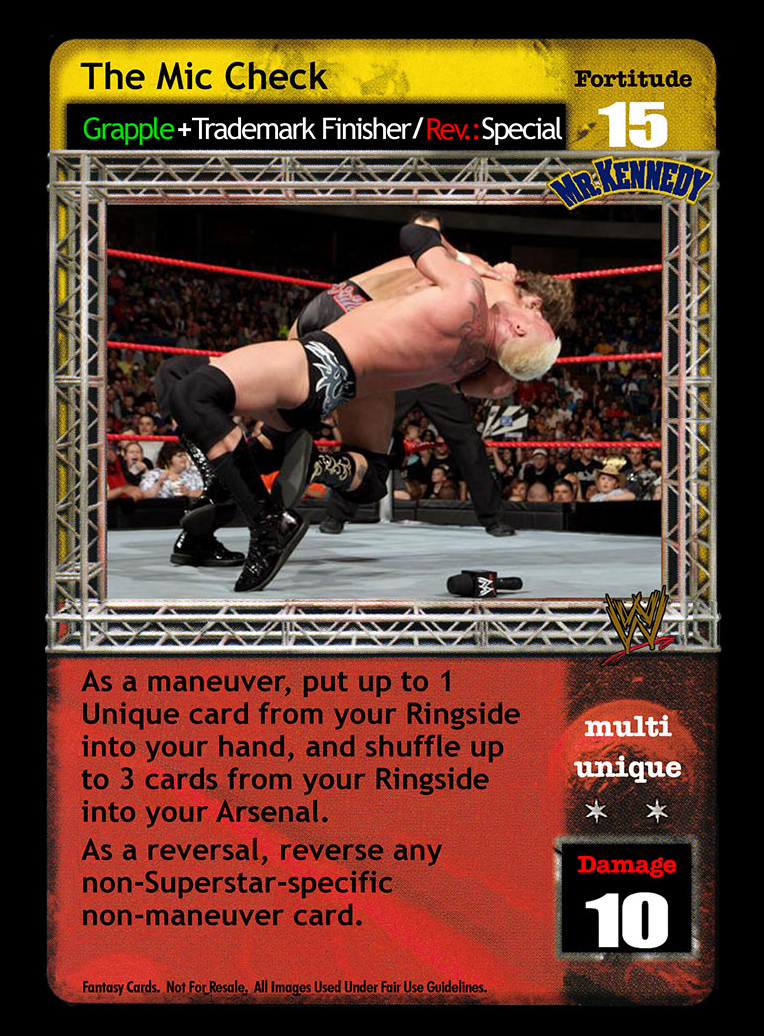As a maneuver, put up to 1 Unique card from your Ringside into your hand, and shuffle up to 3 cards from your Ringside into your Arsenal. As a reversal, reverse any non-Superstar-specific non-maneuver card.