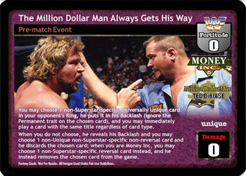 You may choose 1 non-Superstar-specific Universally Unique card in your opponent's Ring, he puts it in his Backlash (ignore the Permanent trait on the chosen card), and you may immediately play a card with the same title regardless of card type. When you do not choose, he reveals his Backlash and you may choose 1 non-Unique non-Superstar-specific non-reversal card and he discards the chosen card; when you are Money Inc, you may choose 1 non-Superstar-specific non-RMS reversal card instead, and he instead removes the chosen card from the game.