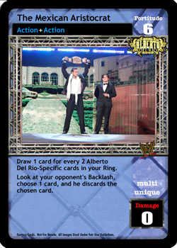 Draw 1 card for every 2 Alberto Del Rio-Specific cards in your Ring. Look at your opponent's Backlash, choose 1 card, and he discards the chosen card.