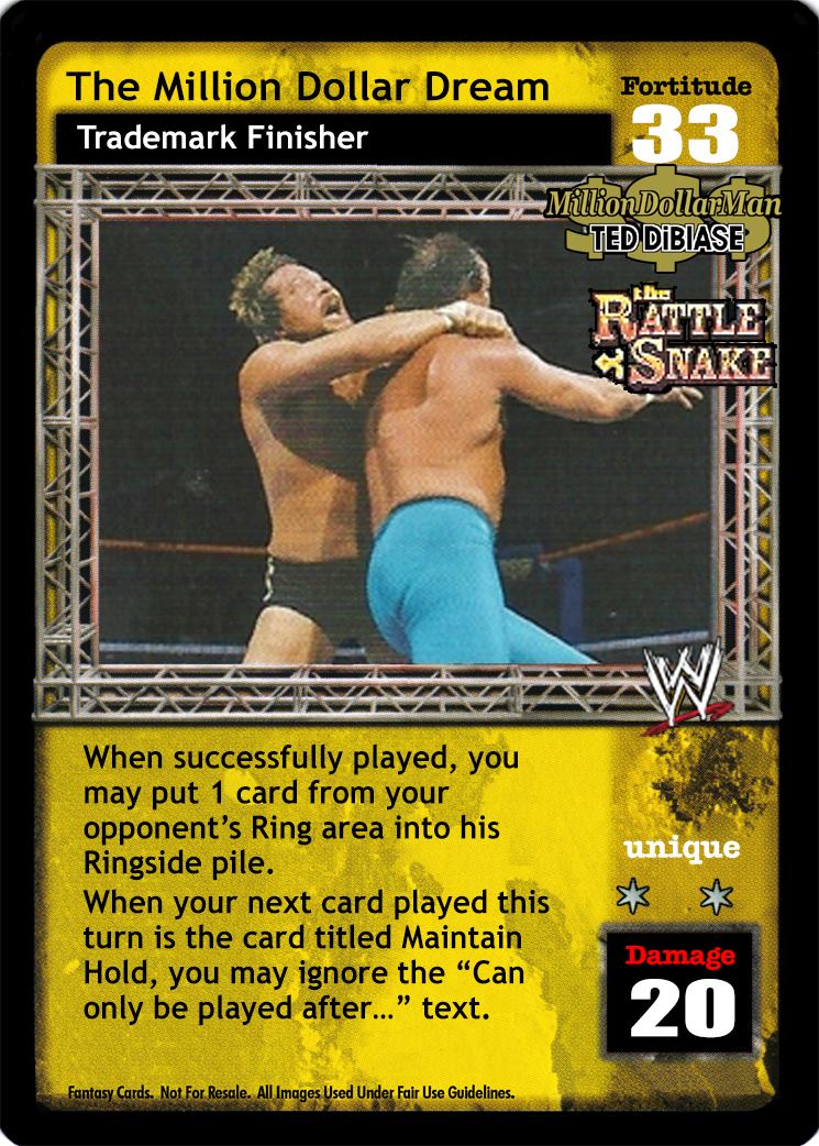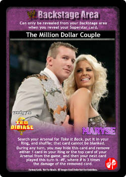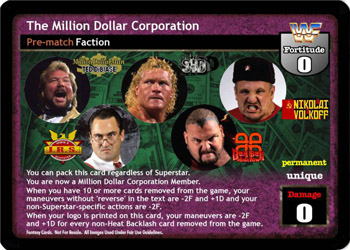 You can pack this card regardless of Superstar. You are now a Million Dollar Corporation Member. When you have 10 or more cards removed from the game, your maneuvers without 'reverse' in the text are -2F and +1D, and your non-Superstar-specific actions are -2F. When your logo is printed on this card, your maneuvers are -2F and +1D for every non-Heat Backlash card removed from the game.