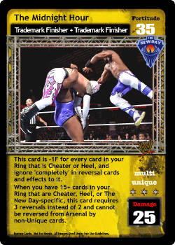 This card is -1F for every card in your Ring that is Cheater or Heel, and ignore 'completely' in reversal cards and effects to it. When you have 15+ cards in your Ring that are Cheater, Heel, or The New Day-specific, this card requires 3 reversals instead of 2 and cannot be reversed from Arsenal by non-Unique cards.