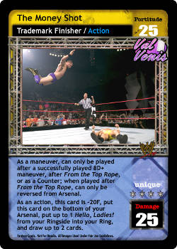 As a maneuver, can only be played after a successfully played 8D or greater maneuver, after From the Top Rope, or as a Counter; when played after From the Top Rope, can only be reversed from Arsenal. As an action, this card is -20F, put this card on the bottom of your Arsenal, put up to 1 Hello, Ladies! from your Ringside into your Ring, and draw up to 2 cards.